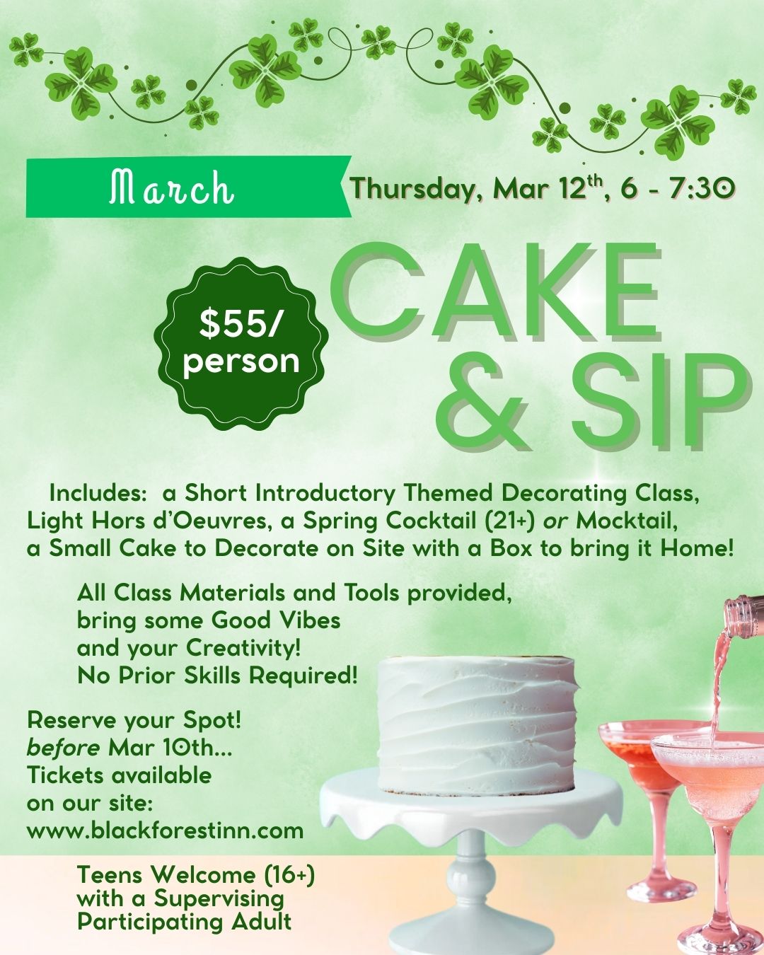 This Month’s Theme: St. Patrick’s Day, of course! Plus a compare/contrast demonstration & tasting of American Buttercream and Swiss Meringue Buttercream! Reserve with your ticket purchase by Tuesday, March 10th. Tickets available *here*. Come for Fun, Stay for Dinner! Try our new Mini Tasting Menu with smaller portions! (Ticket Price for Class Only)